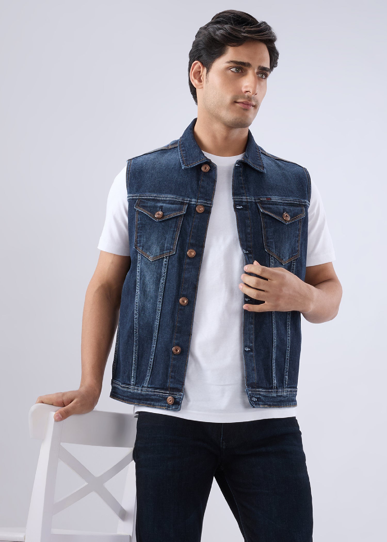 The Nostrum Aayas sleeveless denim jacket is designed for effortless layering with a timeless appeal. Crafted from durable denim fabric, it features a structured silhouette with a button-down front and functional flap pockets that add a rugged yet refined touch. Perfect for casual outings or street-style looks, this jacket elevates everyday outfits while offering comfort and versatility. Style it over a basic tee or hoodie for a confident, modern look.
