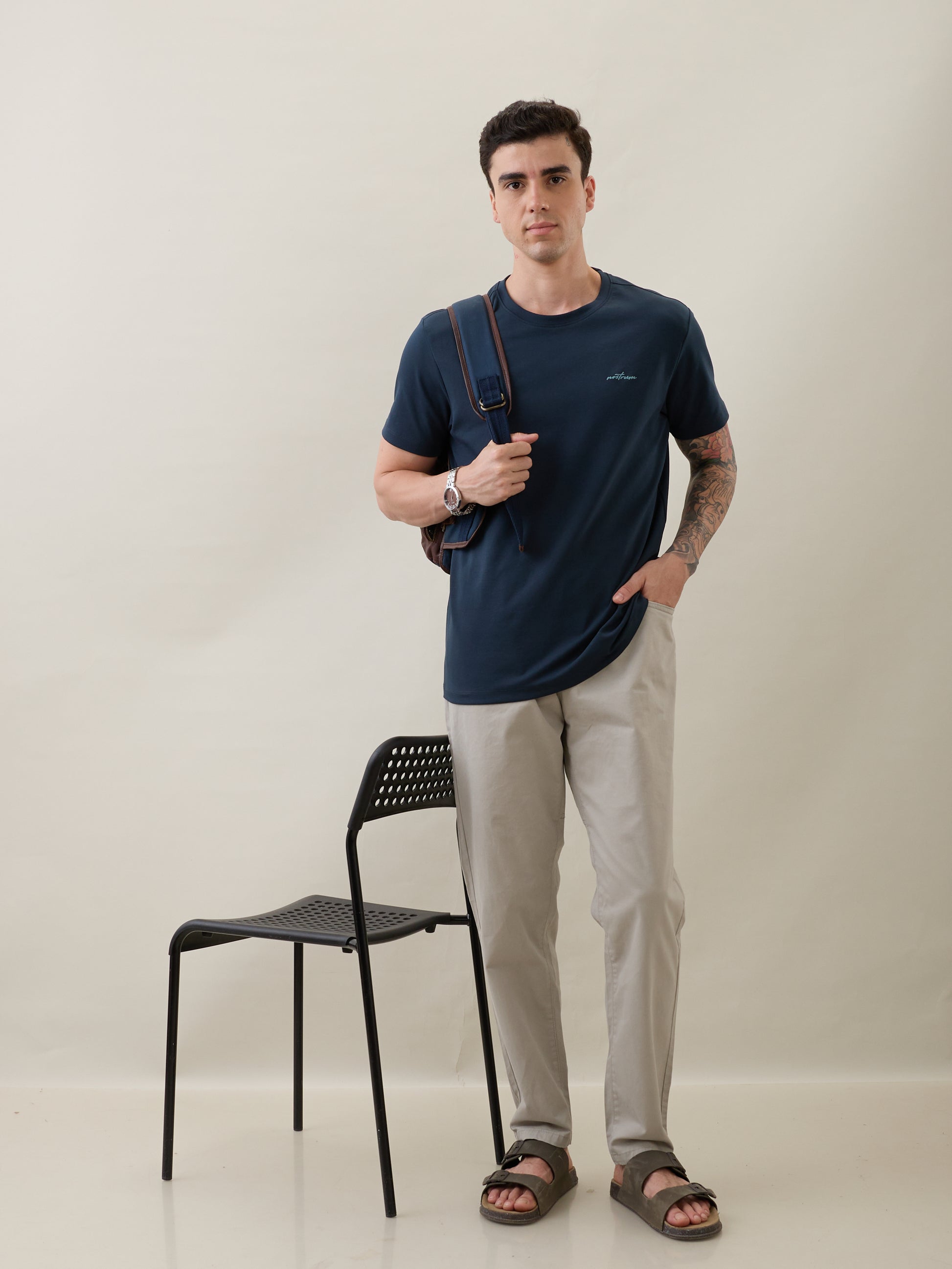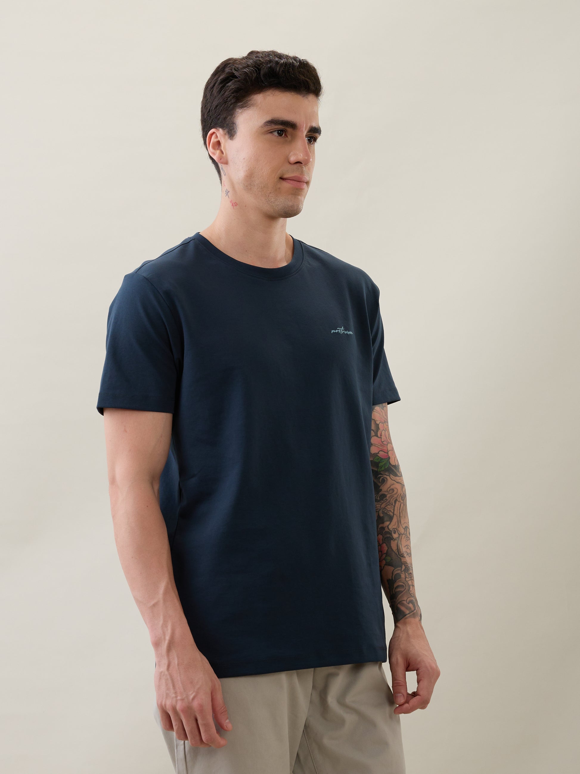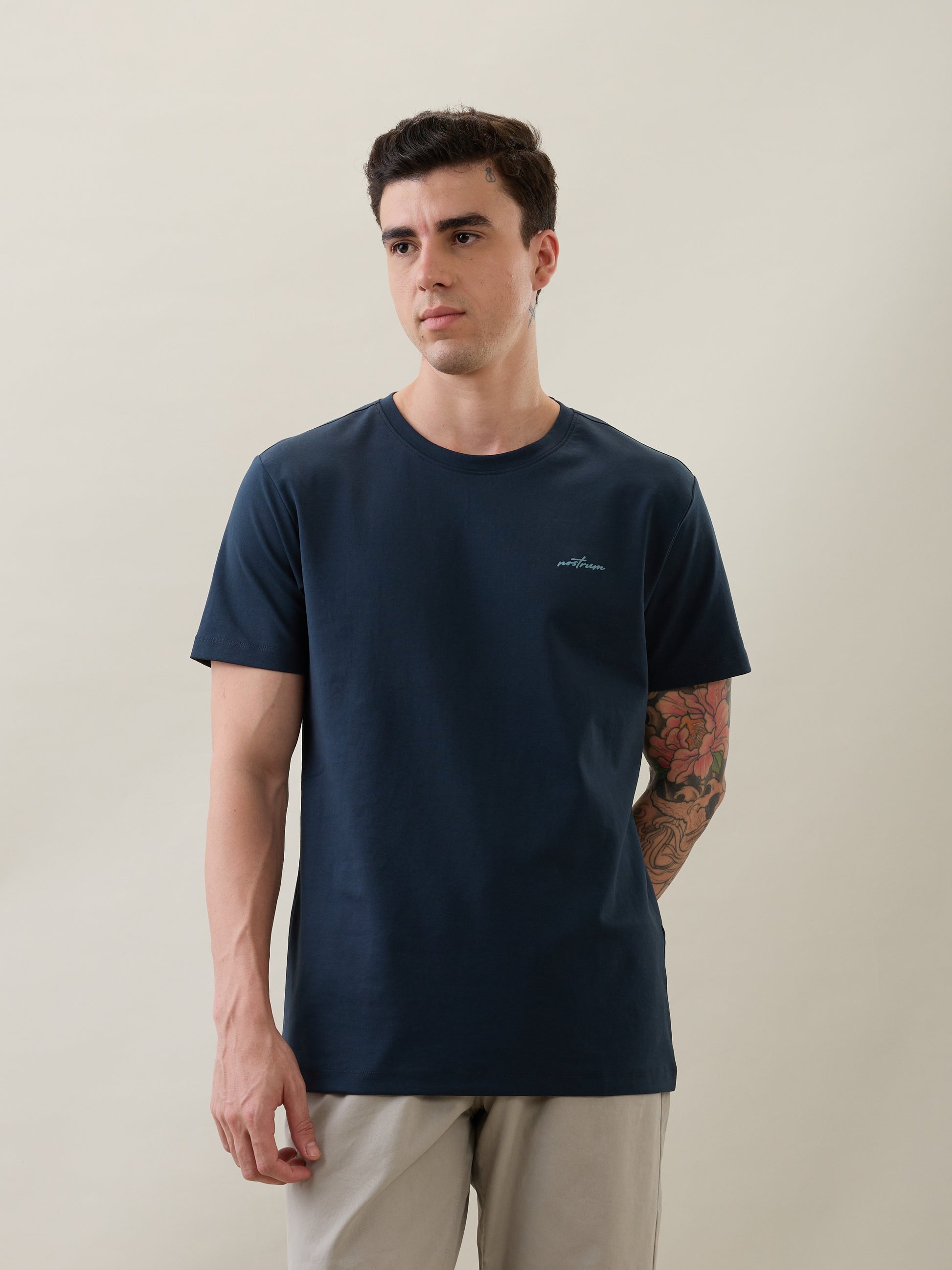 The Nostrum Fateful Dark Blue Tee brings effortless minimal style with a touch of vintage character. Crafted in a rich brown shade, this crew-neck T-shirt features a clean script-style logo on the left chest for a subtle branded look. The back showcases a softly faded star graphic placed at the upper center, paired with a small text detail for added depth. Made from comfortable, breathable fabric with a casual fit, it’s an easy essential that pairs well with cargos, denims, or everyday streetwear outfits.