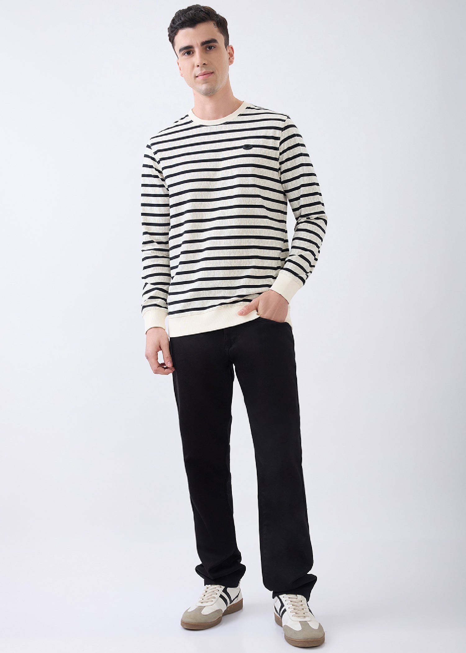 The FIREBALL CREAM sweatshirt brings a bold yet refined look to everyday casual wear. Designed with classic horizontal stripes in contrasting tones, it offers a modern update to a timeless pattern. Crafted from a soft, breathable knit fabric, this sweatshirt ensures all-day comfort while maintaining a structured, polished silhouette. Ideal for casual outings or smart-casual styling, it pairs effortlessly with jeans or chinos.