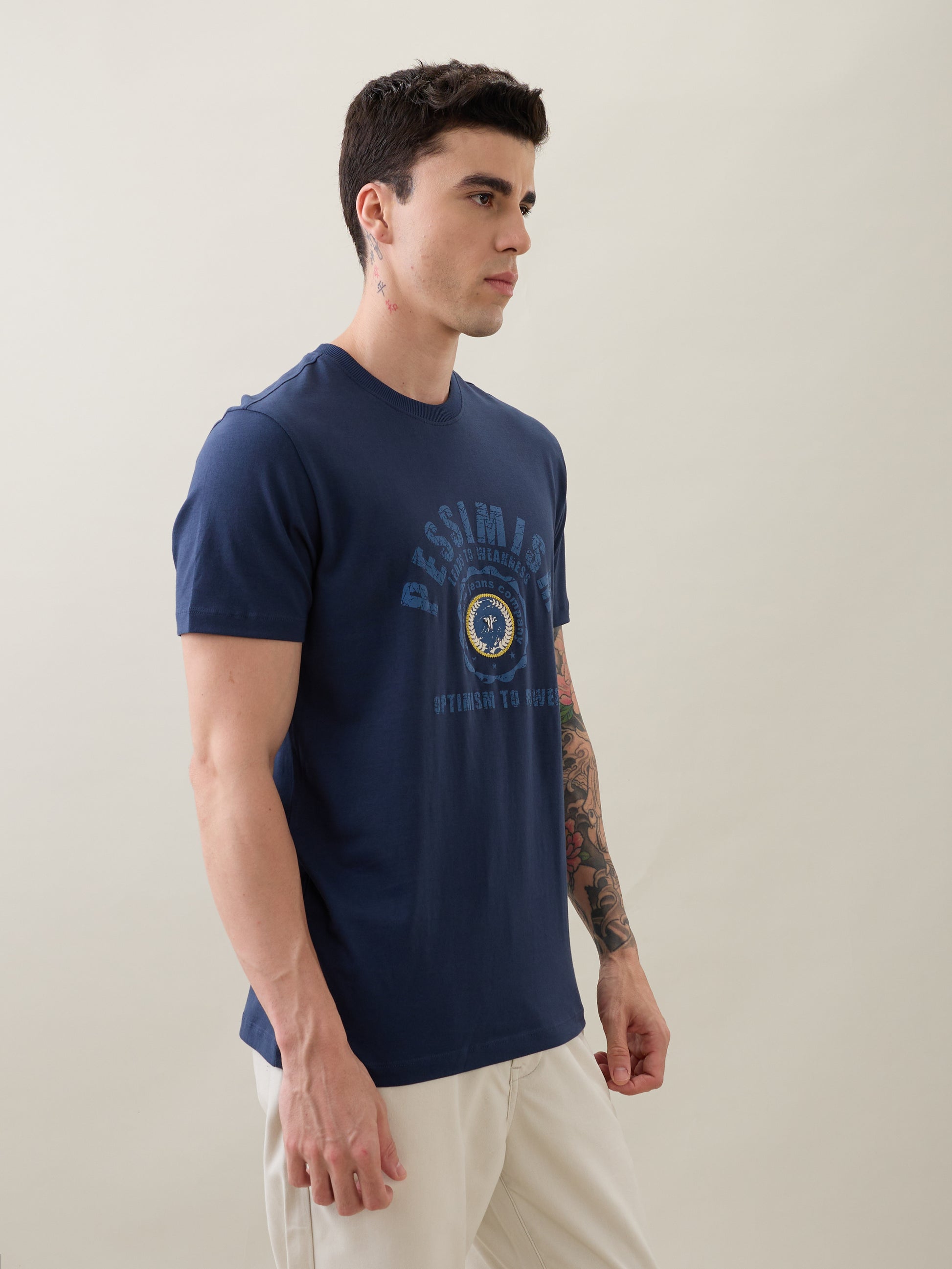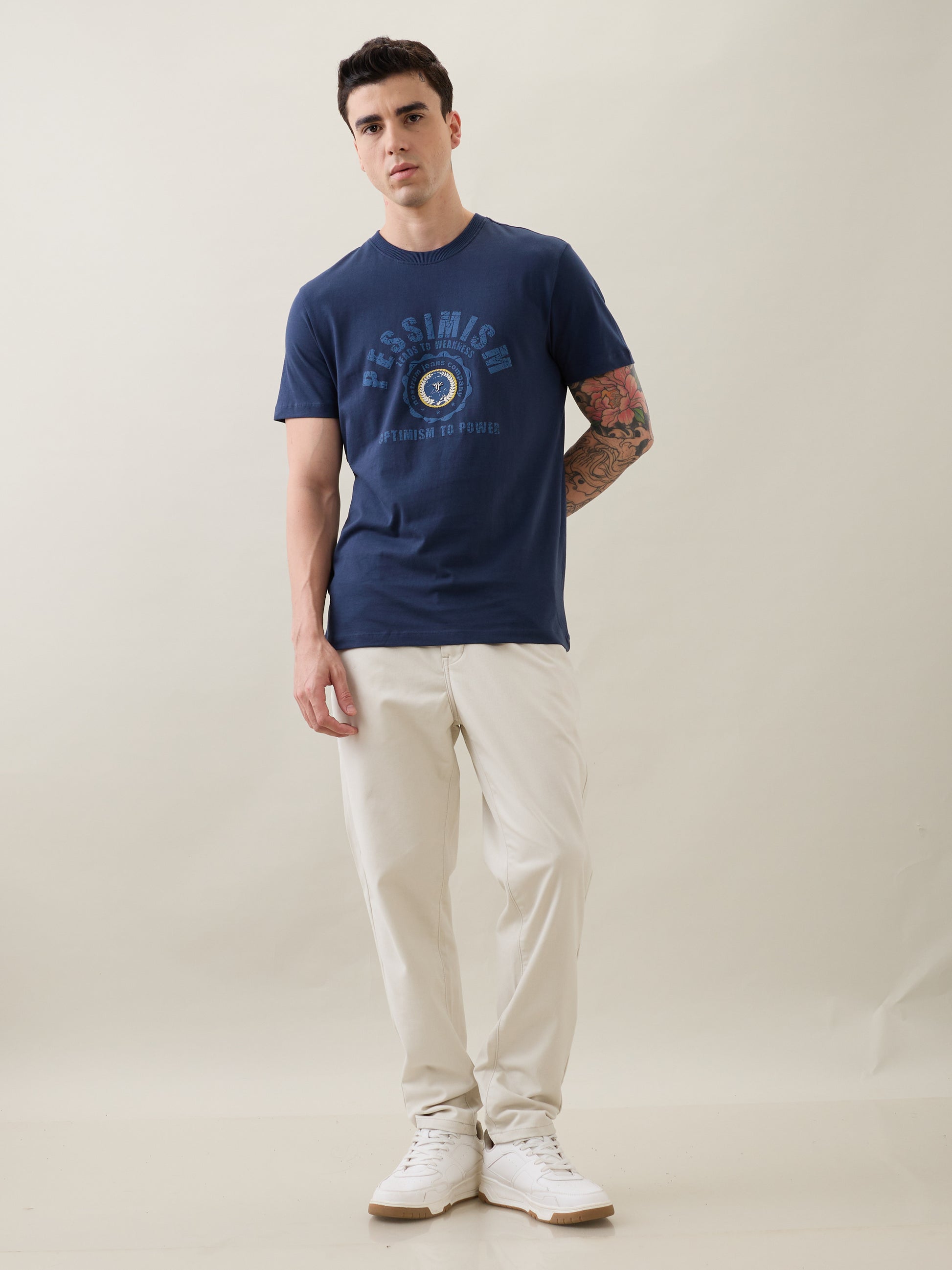 The Nostrum Glitch Hex Blue Tee blends collegiate charm with bold streetwear attitude. Designed in a deep navy-toned blue, the front showcases a striking varsity-style graphic featuring the word “PESSIMISM”, paired with an embroidered circular emblem for added texture and depth. Beneath it, the phrase “OPTIMISM TO POWER” ties the look together with a strong visual message. The back remains clean and minimal to keep the focus on the front artwork. Crafted for everyday comfort, this classic-fit tee is perfect for those who like sporty details with a vintage touch.