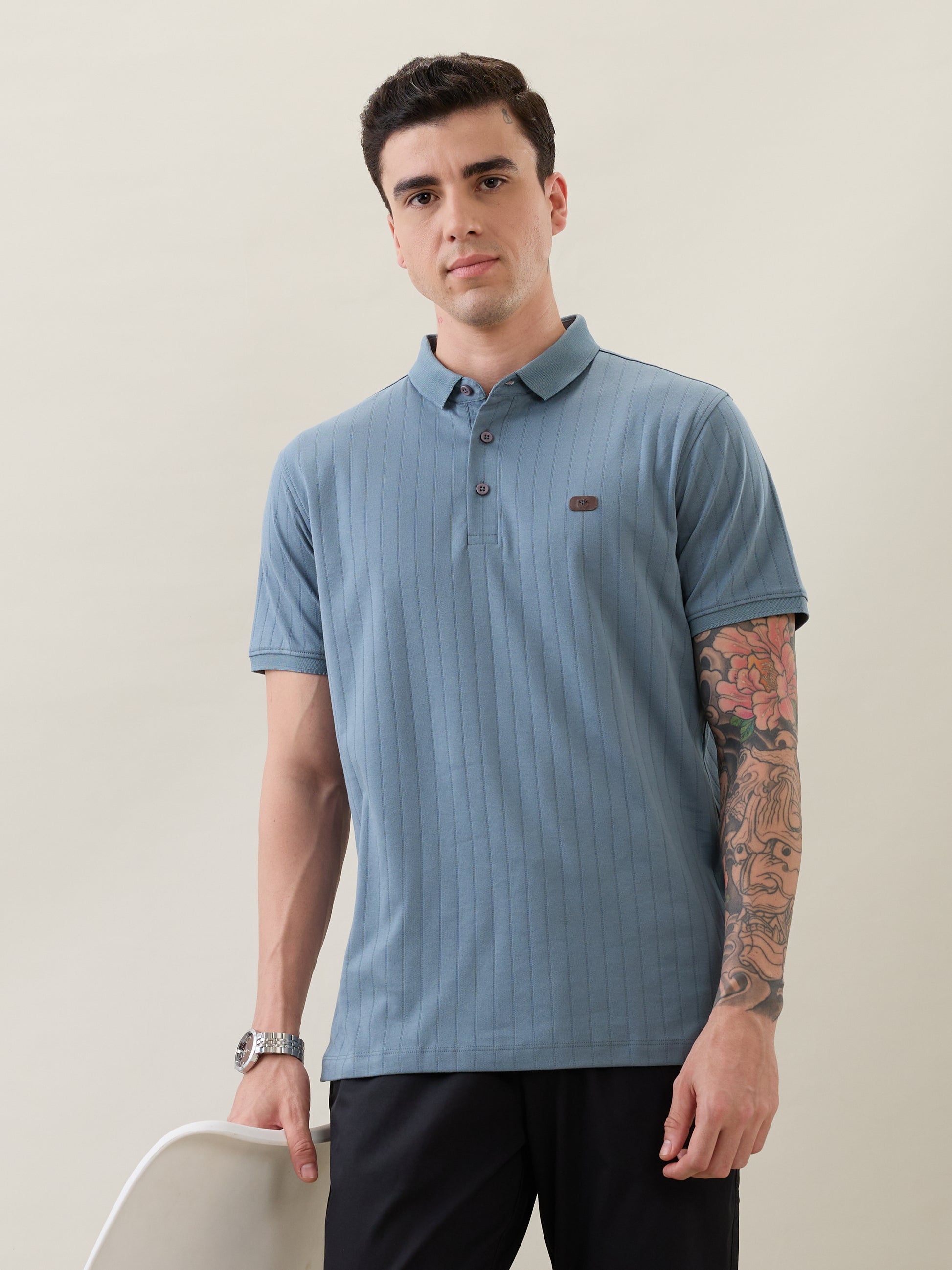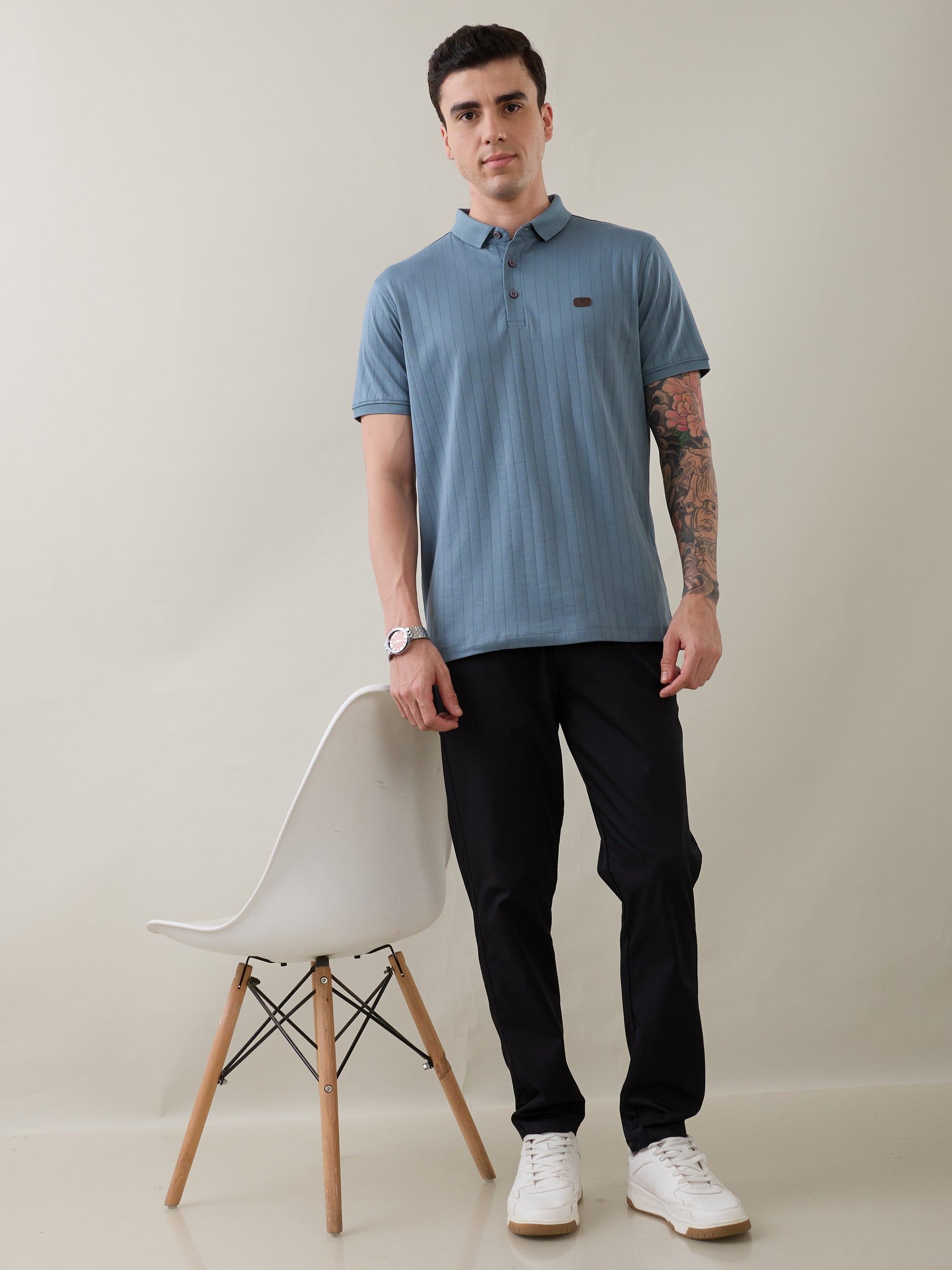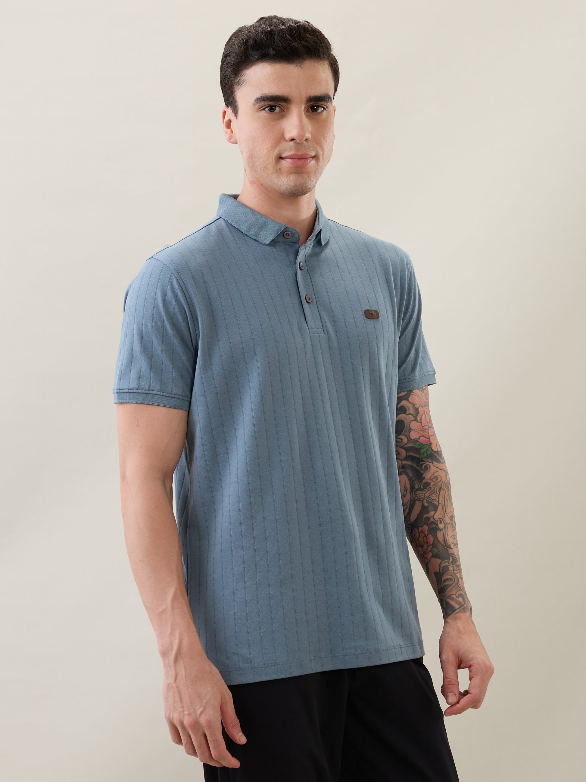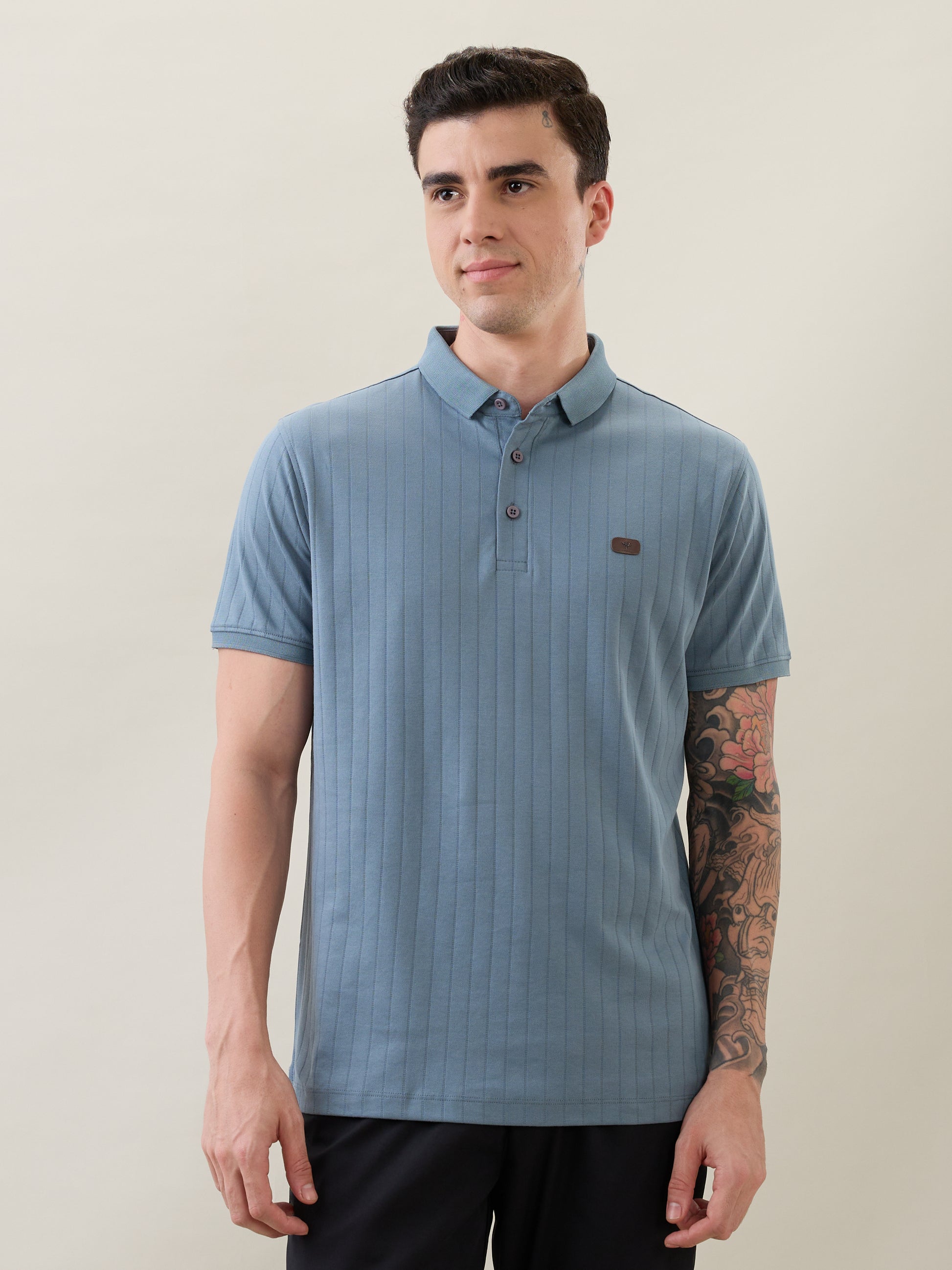 The Nostrum Kinetic Blue Polo Tee blends comfort, craftsmanship, and style in one. Made from soft polycotton fabric, it features a rib-knit texture, button-down polo collar, and ribbed sleeve cuffs that add structure and sophistication. Designed for durability and everyday versatility, it transitions effortlessly from workdays to weekends — making it a true wardrobe essential.