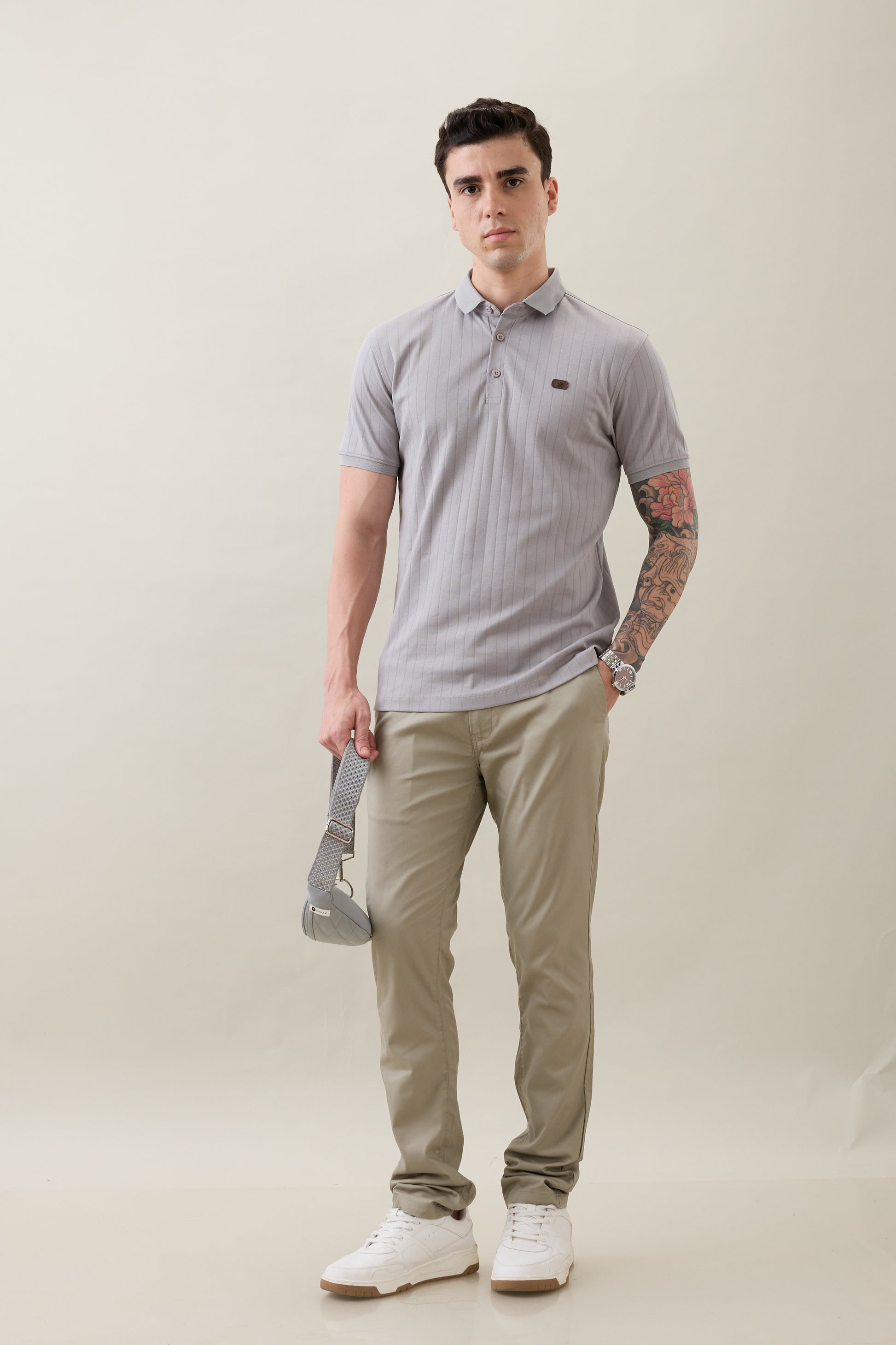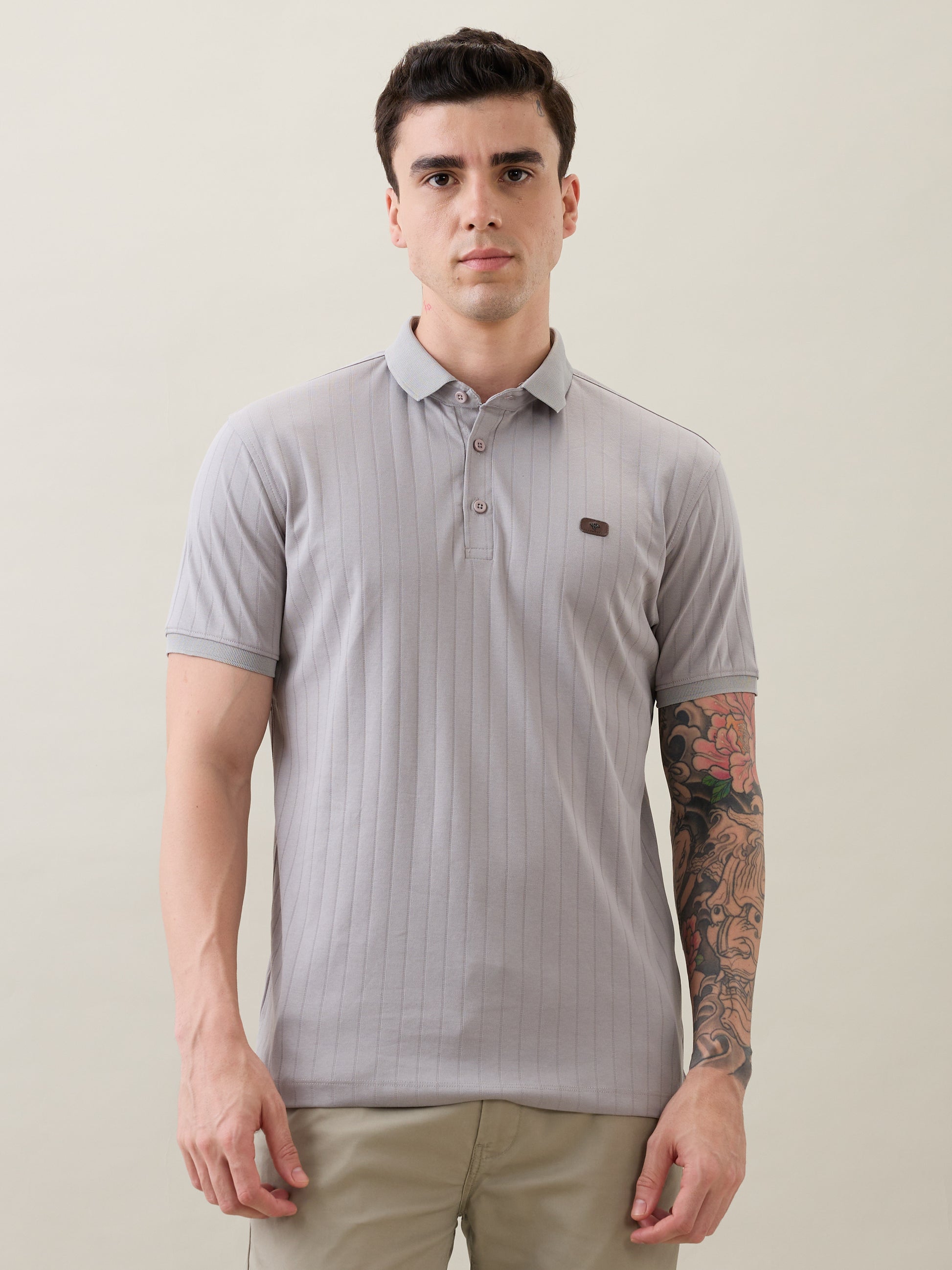 The Nostrum Kinetic Light Grey Polo Tee blends comfort, craftsmanship, and style in one. Made from soft polycotton fabric, it features a rib-knit texture, button-down polo collar, and ribbed sleeve cuffs that add structure and sophistication. Designed for durability and everyday versatility, it transitions effortlessly from workdays to weekends — making it a true wardrobe essential.