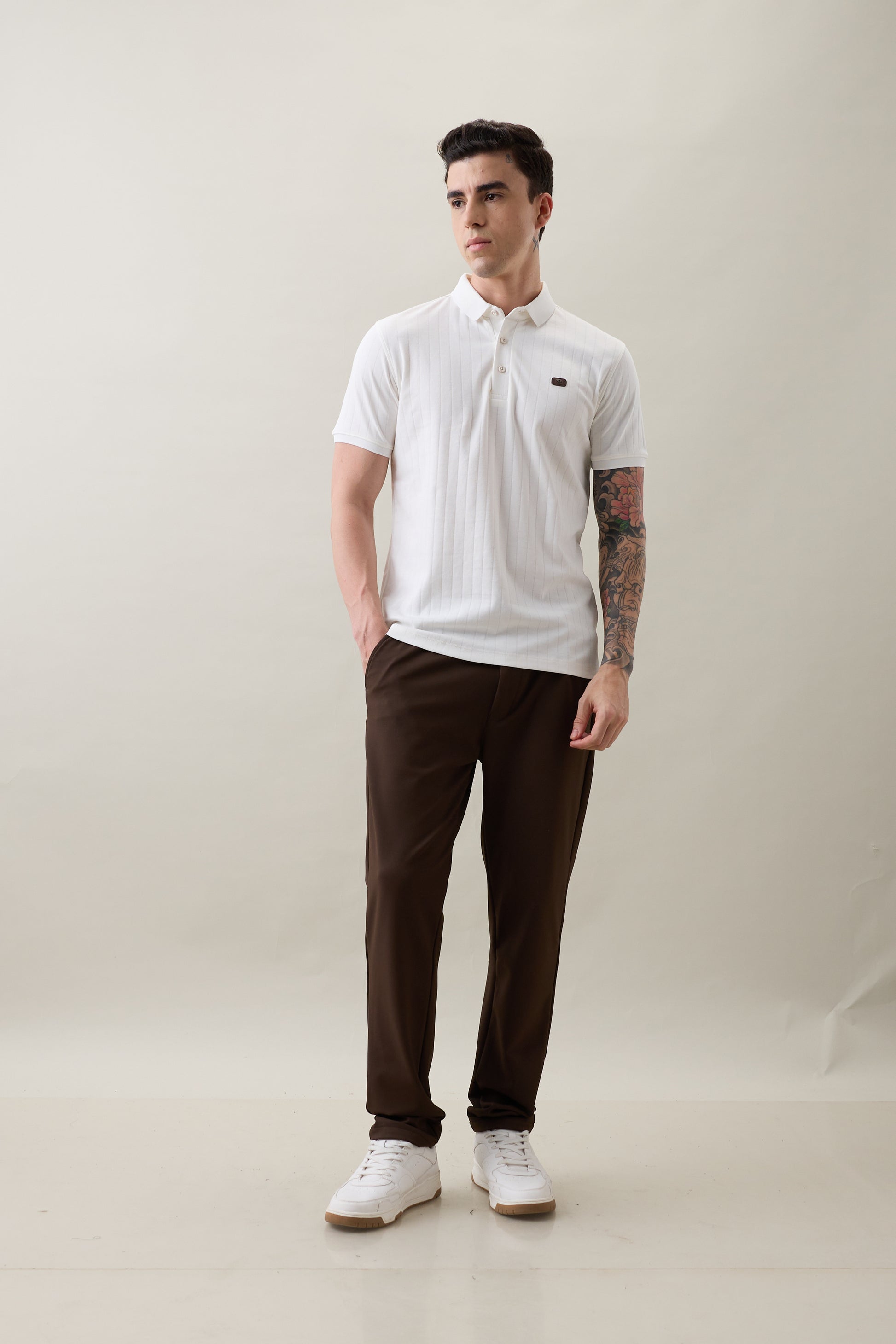 The Nostrum Kinetic White Polo Tee blends comfort, craftsmanship, and style in one. Made from soft polycotton fabric, it features a rib-knit texture, button-down polo collar, and ribbed sleeve cuffs that add structure and sophistication. Designed for durability and everyday versatility, it transitions effortlessly from workdays to weekends — making it a true wardrobe essential.