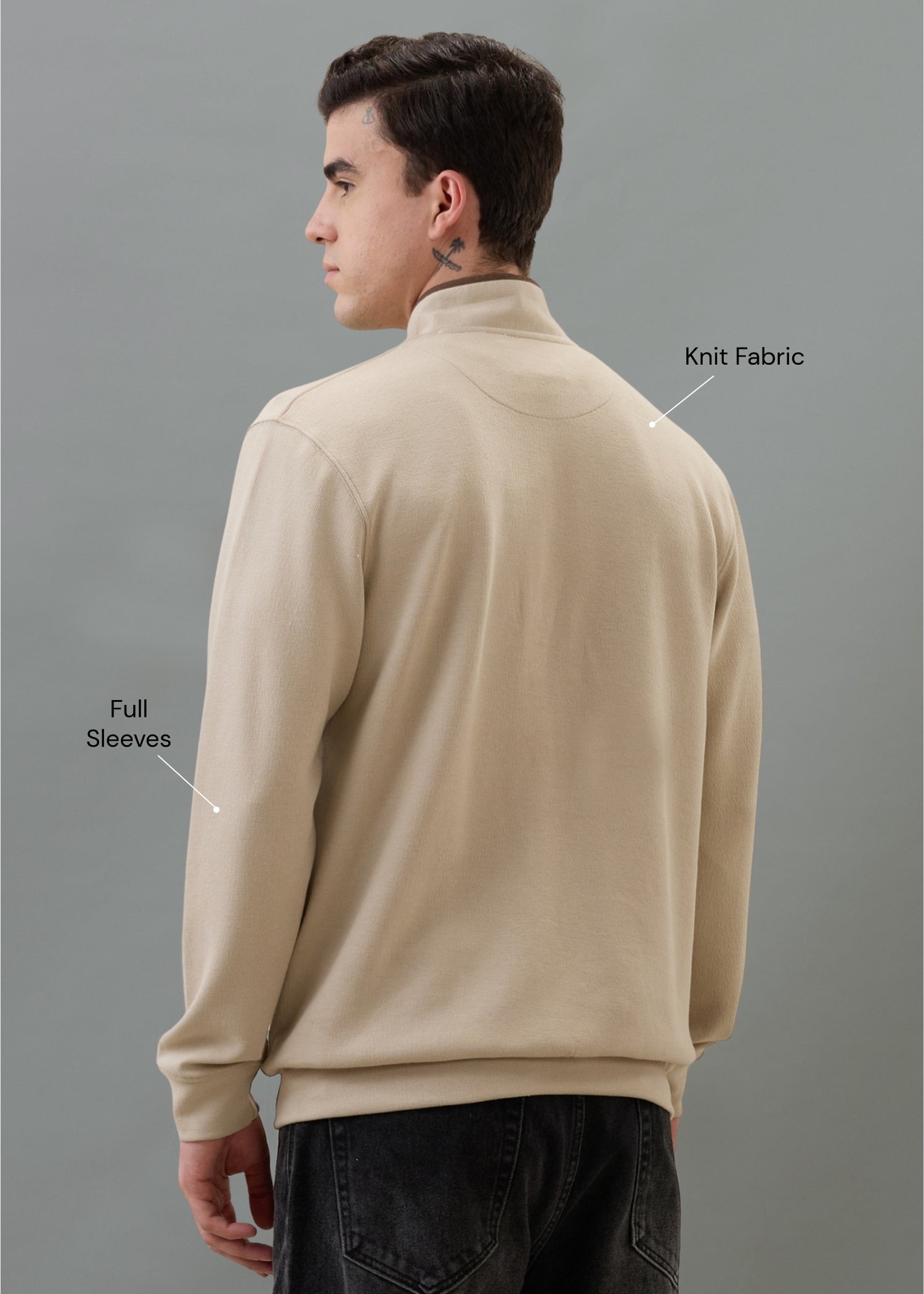 1. Minimal Full-Zip Design: Clean beige sweatshirt with a mock-neck collar for a modern, polished look.