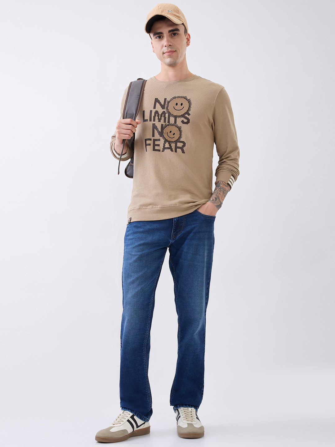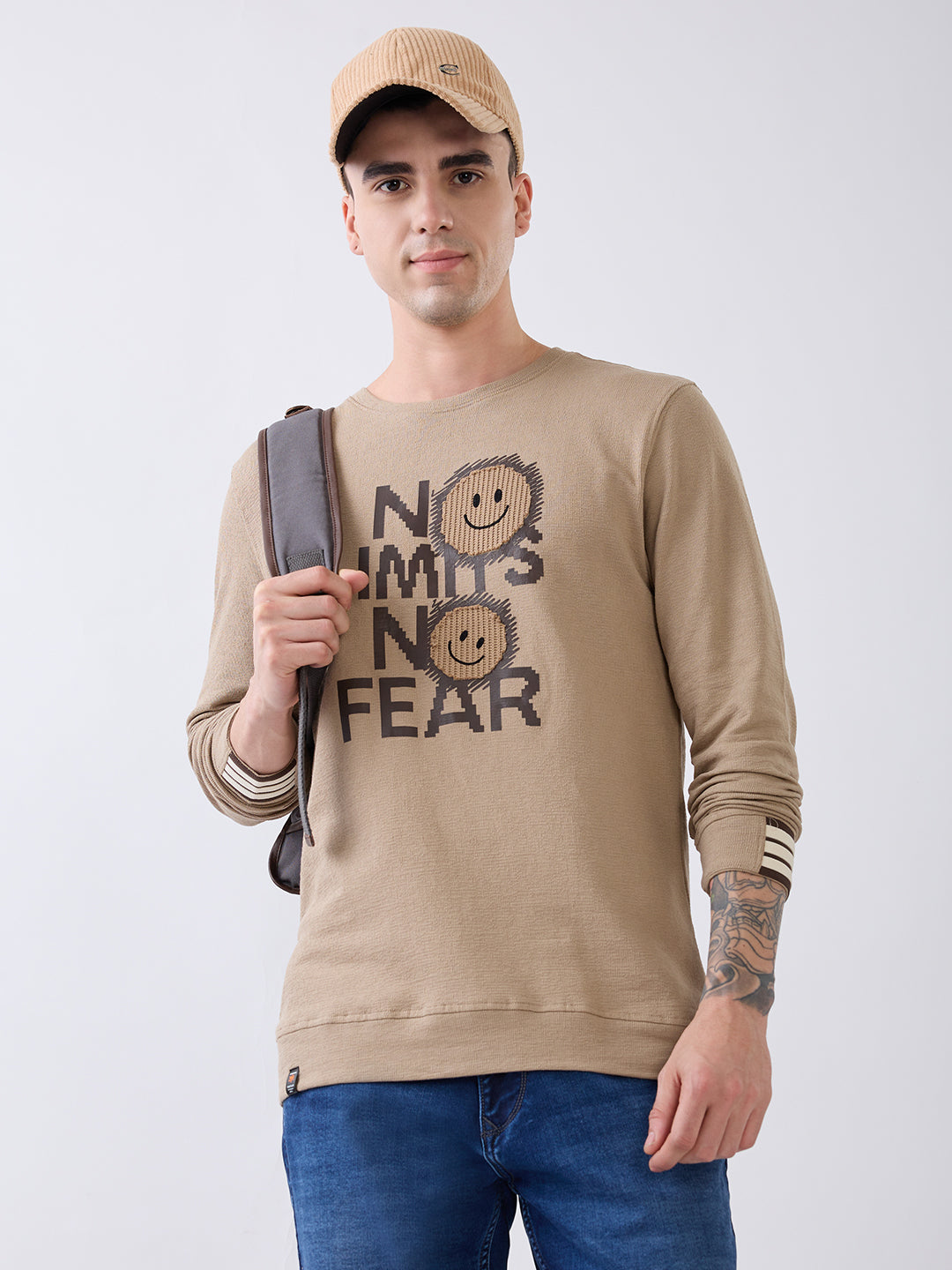 The STAIRWAY L.BROWN sweatshirt adds a playful yet stylish touch to casual wear. Designed in a warm light brown tone, it features a bold typographic graphic with textured smiley accents on the front, creating a fun and expressive look. Made from soft, breathable fabric, this sweatshirt offers everyday comfort while standing out with its unique design—perfect for relaxed outings and casual styling.